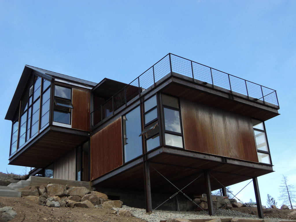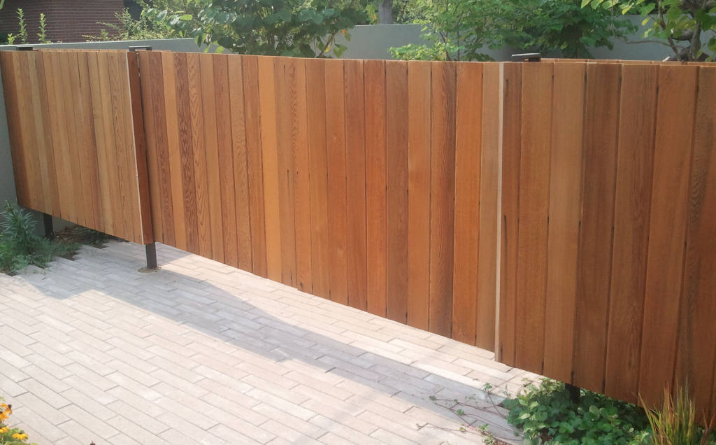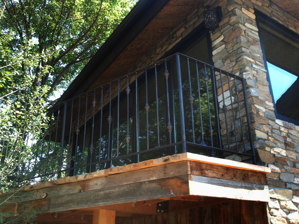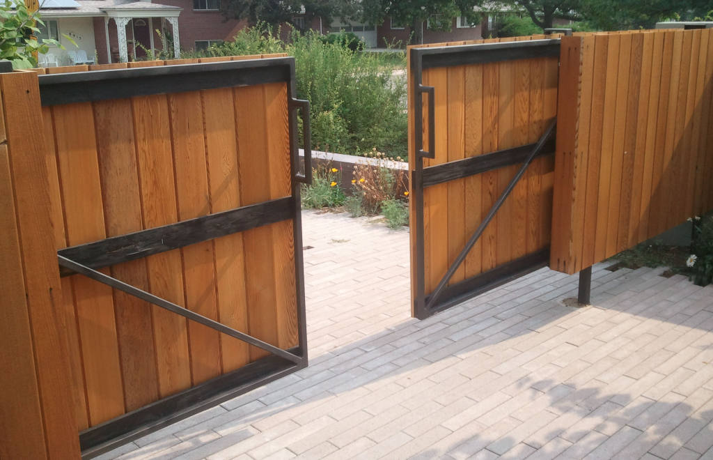 | Custom design sliding gate. Welded steel frame with rollers. | | face view of clean cedar planks. | | Welded wire and powder coated deck rail in a new contemporary mountain home. |