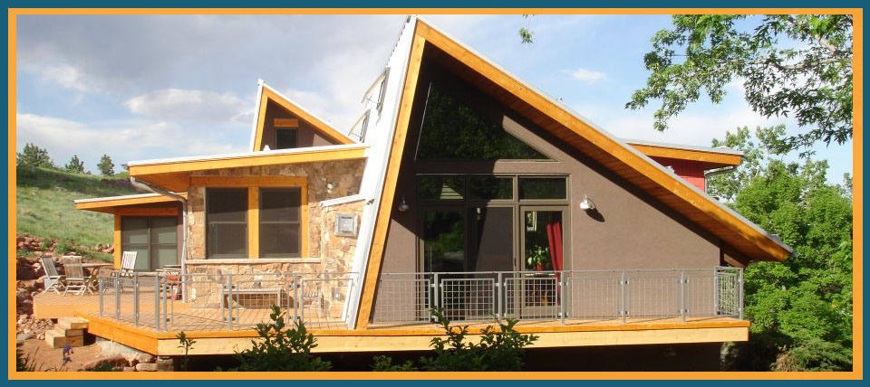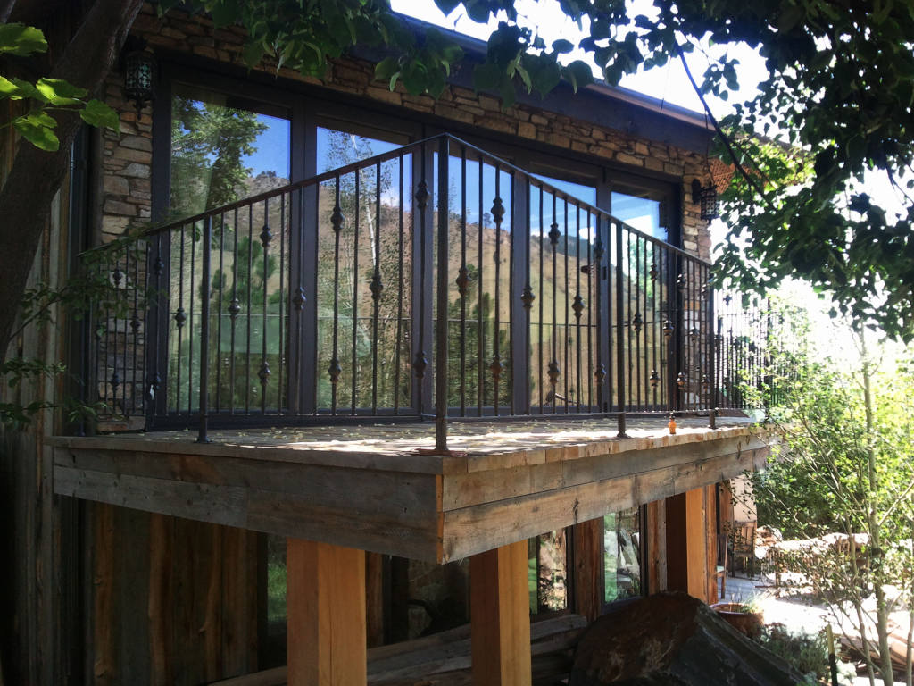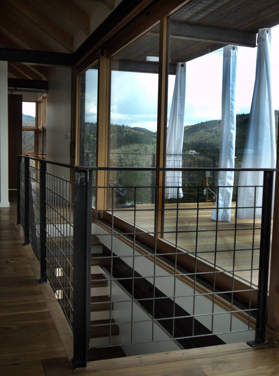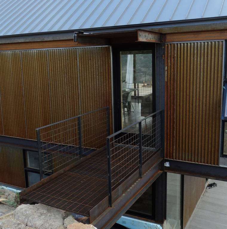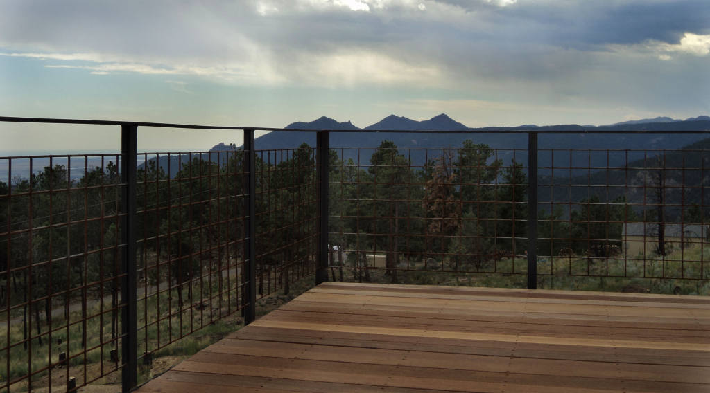 | architectural metalwork on a custom Boulder home | | Custom front entry deck rusted steel handrail and exterior clear coat. | | Welded wire deck rail with Ipe decking. |