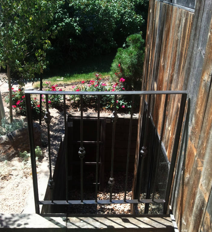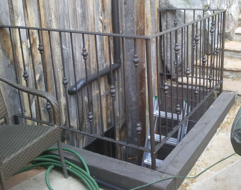 | Traditional ornamental wrought ironwork deck rail. | | | | Traditional Ornamental wrought iron work window well guard rail. |