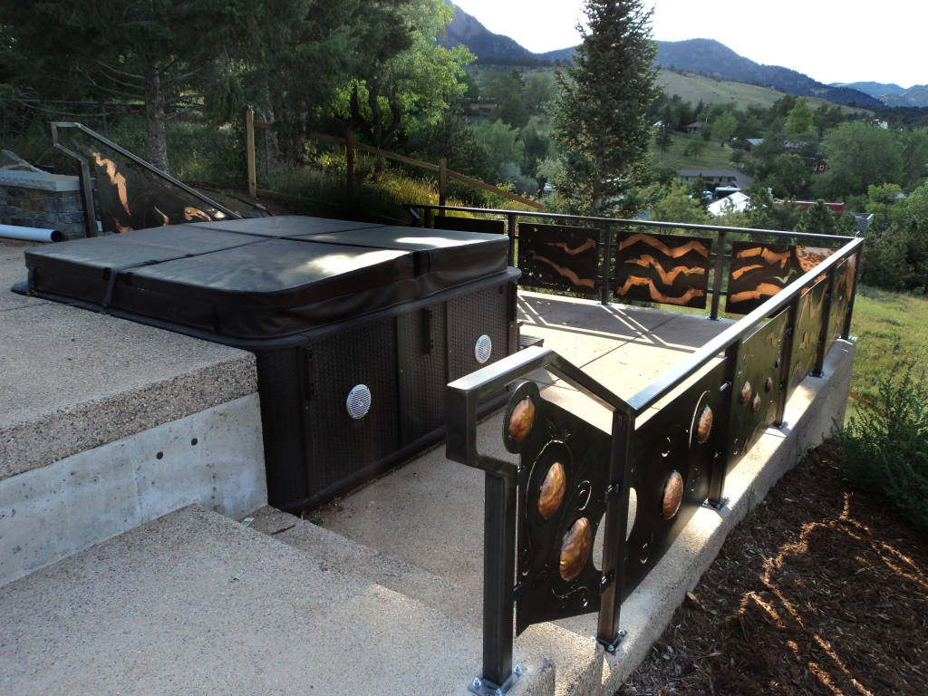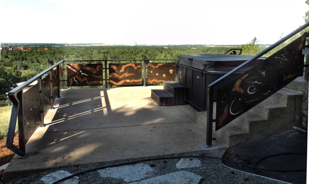 | Custom metal privacy fence. | | Boulder steel privacy rail. | | Double sided, fabricated with steel and copper accents. |