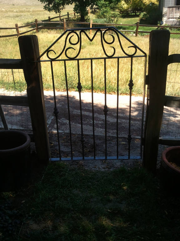 | custom wrought iron monogram gate. | | Ornamental iron grab rail and window well guard. | | Custom hand forged front entry gate with monogram. |