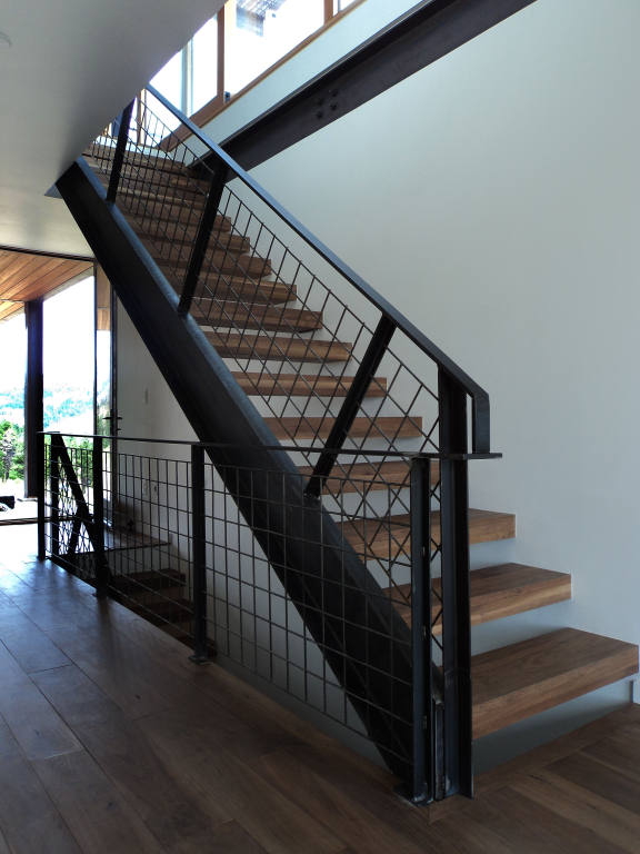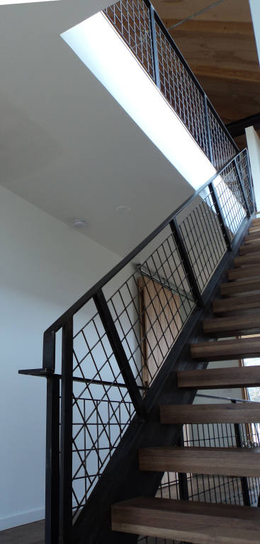 | Custom steel and walnut stairs with natural steel patina. | | | | top level guard railing and termination. |