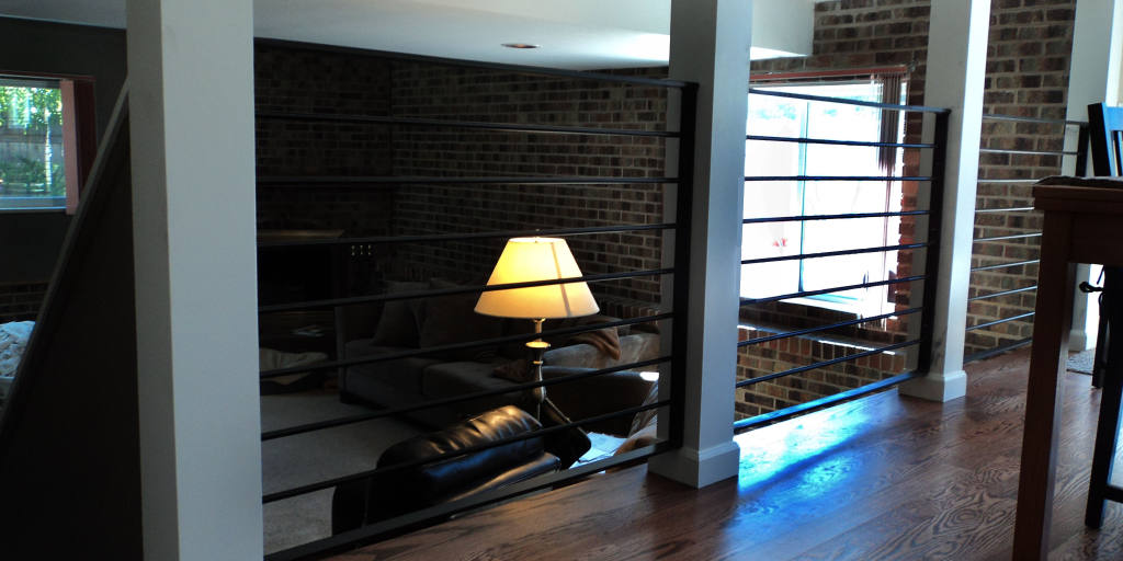 | Steel and copper accent. | | Welded wire and powdercoated deck railing. | | |