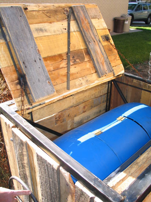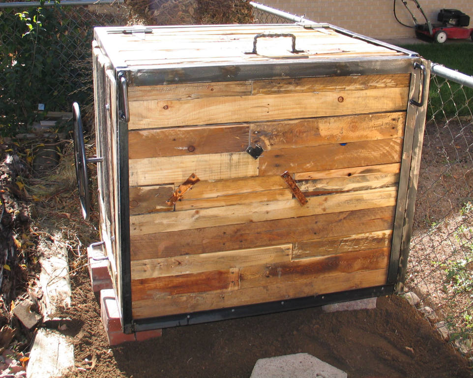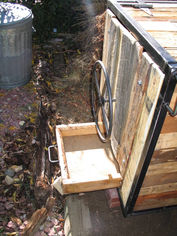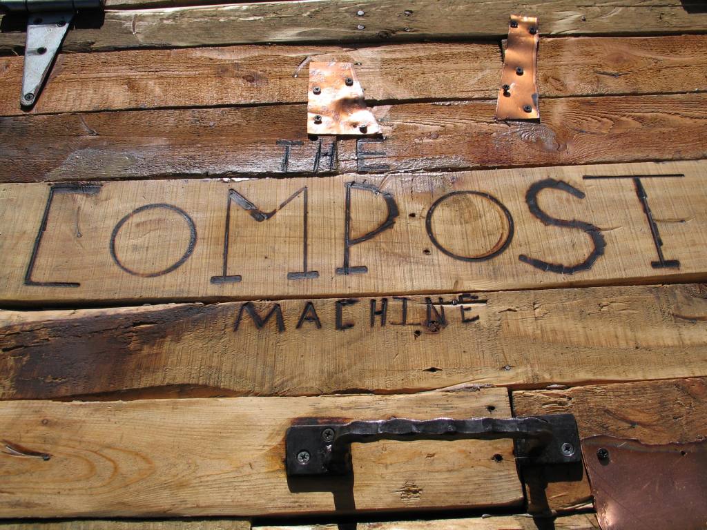 | The Compost Machine | | Compost box, welded frame and recycled pallets. | | Hand rolled and welded metal wheel. |