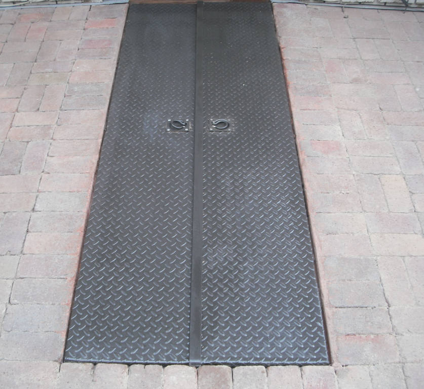 | Branded recycled wood lid. | | Custom steel diamond plate cellar door. Waterproof and powder coating finish. | | Hand rolled and welded metal table frame. |